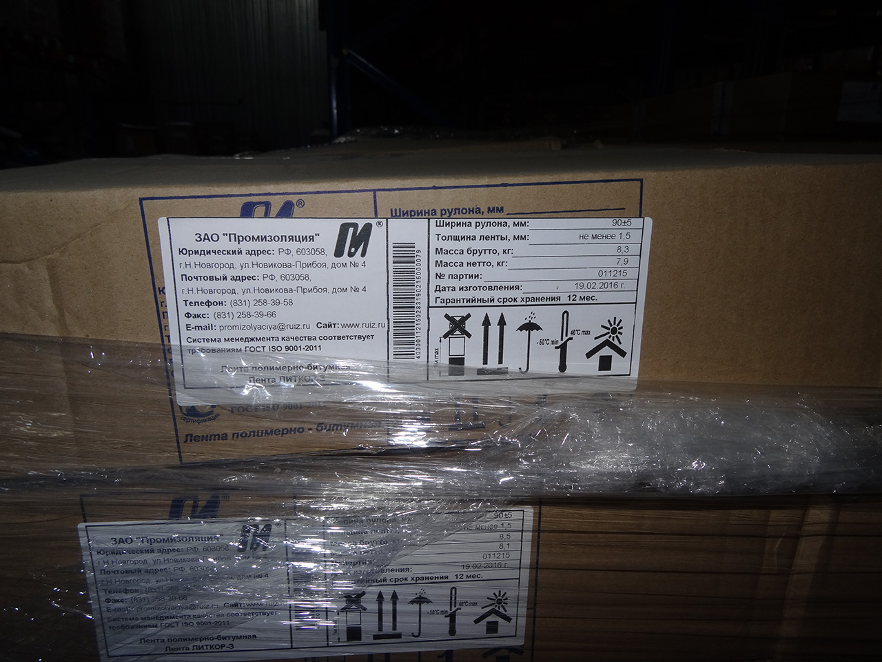 Коробка снабжена биркой со штрих-кодом, данными о ленте, адресом производителя и знаками обращения с грузом.