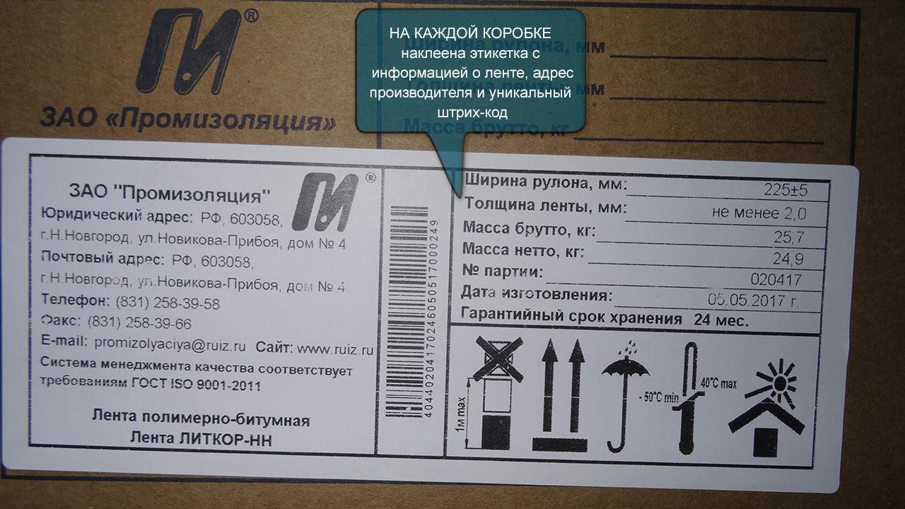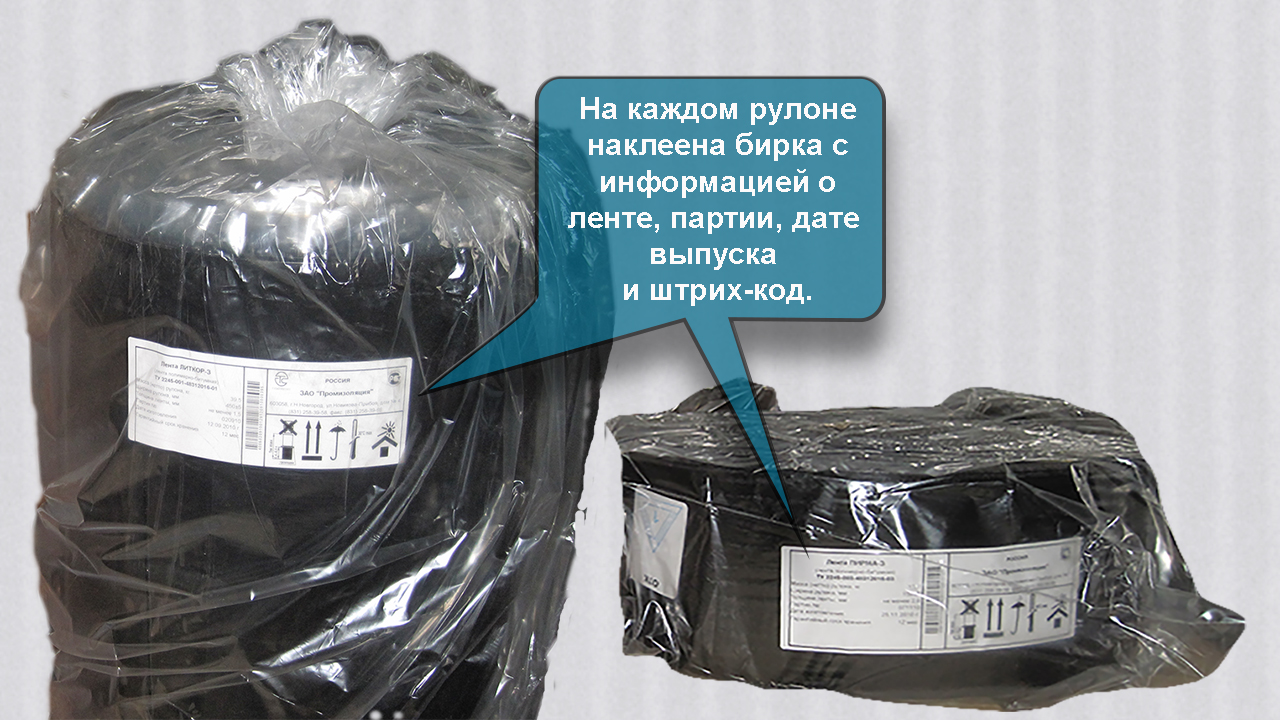 На рулоне присутствует бирка со штрих-кодом, информацией о ленте, адресом предприятия и манипуляционными знаками.