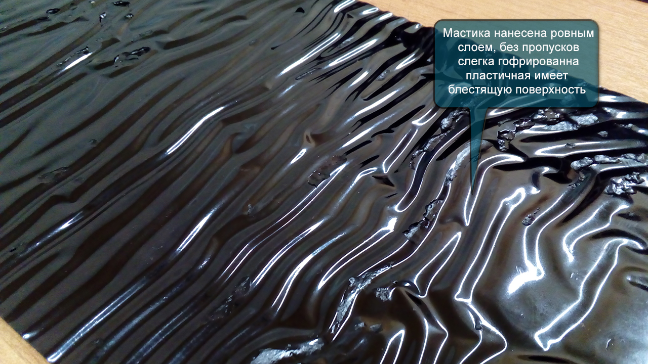 Мастичный слой ровный, слегка гофрированный, пластичный на ощупь, без пропусков и разрывов.